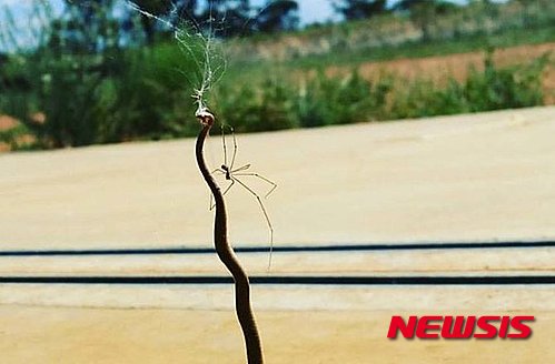 시드니에서 서쪽으로 약 400㎞ 떨어진 위살에서 농사를 짓는 패트릭 리스는 지난 6일 자신의 집 정원에서 브라운 스네이크 한 마리가 거미줄에 매달려 죽어 있고 유령거미 한 마리가 죽은 독사를 물고 있는 것을 발견, 깜짝 놀랐다.