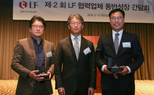 오규식(가운데) LF 대표이사가 지난 12일 서울 서초구 반포동 반포원에서 열린 ‘제2회 LF협력업체 동반성장 간담회’에서 80억 원 규모의 동반성장 기금 조성을 통한 협력업체 자금 지원 계획을 밝힌 후 우수사례 발표 협력업체 대표들과 기념촬영을 하고 있다.