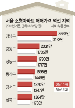 하지만 최근에는 소형 아파트 매매가격이 중대형을 추월하고 있다. 지난해의 경우 서울 25개 구 중 절반 이상인 14개 구의 소형 아파트의 3.3㎡당 매매가격이 중대형 아파트를 앞질렀다. 강남구를 중심으로 보였던 소형 아파트 품귀 현상이 서울 전 지역으로 확산된 것이다.