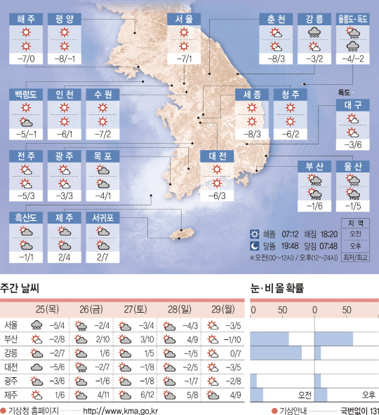 전국이 대체로 맑겠으나, 강원 영동과 경상 동해안은 동풍의 영향으로 눈 또는 비(강수확률 60~80%)가 오다가 오후에 점차 그치겠다. 아침 최저기온은 영하 10도에서 영하 1도, 낮 최고기온은 영상 1도에서 6도가 되겠다.