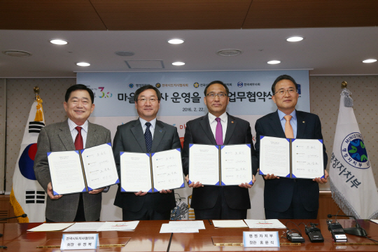 백운찬(사진 오른쪽부터) 한국세무사회 회장, 홍윤식 행정자치부 장관, 유정복 전국시·도지사협의회 회장, 조충훈 전국시장·군수·구청장협의회 회장은 22일 정부서울청사에서 마을세무사 제도를 전국 단위로 확대하고 지원하기 위한 내용의 업무협약(MOU)을 체결했다. 이 협약에 따라 세무사들은 오는 5월부터 전국에서 국세 및 지방세 세무상담과 지방세 관련 불복 청구 등을 돕는 재능기부를 하게 된다.