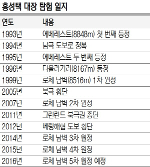홍 대장의 탐험 여정은 1993년 에베레스트 등정부터 시작됐다. 이후 남극점(1994년)과 북극점(2005년)을 다녀왔고 그린란드(2011년), 베링해협(2012년)을 건넜다.