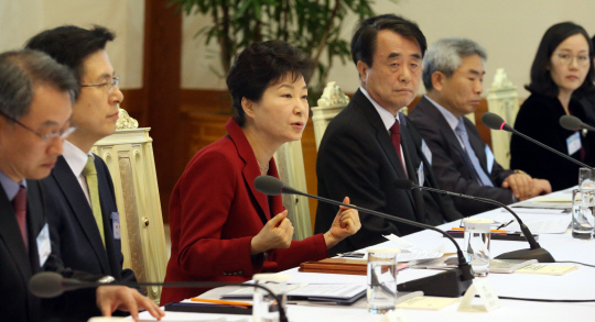 박근혜 대통령이 24일 청와대에서 제8차 국민경제자문회의를 주재하며 모두발언을 하고 있다. 박 대통령은 이 자리에서 “19대 국회가 끝나기 전에 적어도 국민에게 할 수 있는 도리는 다하고 끝을 맺어야 되지 않겠느냐”고 반문한 뒤 “국민에게 희망을 줄 수 있는 일들은 하지 않고 지지해 달라고 하면, 똑같은 형태의 국회를 바라보는 국민으로서는 좌절감밖에 가질 수 없는 일”이라고 강조했다. 박 대통령은 “국회가 그것(법안 처리)을 막아놓고 어떻게 국민한테 또 지지를 호소할 수 있느냐 이거다”라는 대목에서 10초 이상 말을 하지 않는 식으로 안타까움을 토로했다.