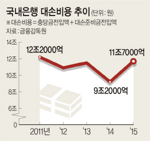 이 같은 은행권의 수익 하락은 대손충당금 ‘폭탄’이 원인이 됐다. 지난해 조선·해운 업종 관련 대기업들이 워크아웃에 들어가면서 국내은행은 대손충당금으로 전년 대비 26.8%나 늘어난 11조7000억 원을 쌓았다. 부실채권이 그만큼 발생했다는 것이다. 산업은행 등 주로 특수은행의 충당금이 대폭 늘었지만, 시중은행도 부실기업 대출에 따른 충당금 적립액이 크게 증가했다. 금감원 공시자료를 통해 파악한 4대 금융지주(신한·KB·하나·농협금융)의 지난해 대손충당금은 총 4조5676억 원으로 전년보다 6.5% 늘었다. 대부분이 은행 계열 대손충당금이었다.
