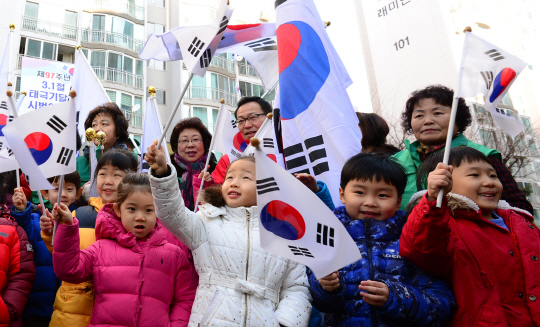 3·1절 97주년을 앞두고 24일 오전 서울 성동구 금호동의 한 아파트에서 입주민과 어린이들이 태극기를 흔들며 환하게 웃고 있다.