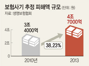 26일 보험업계에 따르면 지난 2013년 기준 보험사기 추정 피해액 규모는 4조7000억 원에 달하는 것으로 집계됐다. 이는 3년 전인 2010년(3조4000억 원) 조사 당시보다 38.23%나 급증한 수치다.