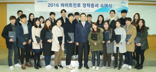 김인규(앞줄 오른쪽 여섯 번째) 하이트진로 사장이 25일 서울 서초동 사옥에서 요식업 종사자 대학생 자녀 22명에게 장학증서를 전달한 뒤 기념촬영을 하고 있다.