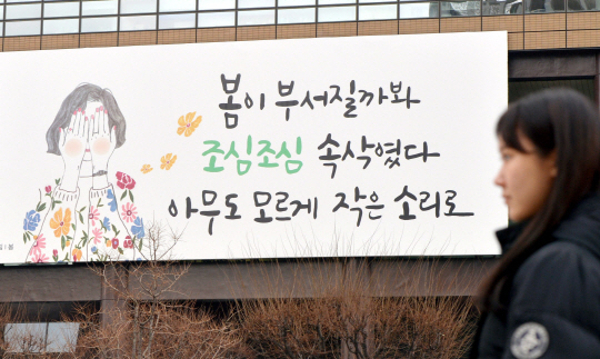봄이 시작되는 가운데 2일 오전 서울 종로구 교보생명 빌딩 광화문 글판에 최하림 시인의 ‘봄’에서 발췌한 문안이 게시돼 있다.