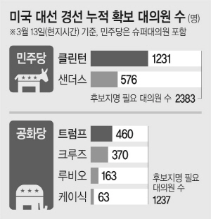 민주당에서는 CBS·유고브 조사 결과 힐러리 클린턴 전 장관이 플로리다(62%대 34%)와 오하이오(52%대 43%)에서 버니 샌더스(버몬트) 상원의원에 앞섰다. 클린턴 전 장관은 노스캐롤라이나에서도 평균지지율 54.8%로 33.3%의 샌더스 의원에 20%포인트 앞서 있고, 미주리에서도 47%대 40%로 리드하고 있다. 샌더스 의원은 일리노이에서 클린턴 전 장관에 앞서며 반격을 준비하고 있다. 이날 일리노이 여론조사 결과 샌더스 의원은 48%의 지지를 얻어 46%의 클린턴 전 장관에 승리할 것으로 예측됐다. 일리노이 여론조사에서 샌더스 의원이 클린턴 전 장관에 승리한 것은 이번이 처음이다.