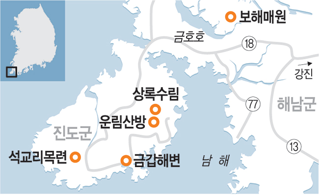 #어디서 묵고 무엇을 맛볼까 = 진도읍에는 새로 문을 연 퍼스트모텔(061-542-1111)이 가장 깔끔하다. 모텔이라지만 붉은 네온등의 느낌이 아니어서 가족숙박도 괜찮다. 금갑 해변 일대에는 펜션과 민박집이 여럿 있다. 해남에서 진도대교를 건너기 직전 왼쪽에 위치한 ‘임하기사식당’(061-535-3121)은 7000원짜리 밥상에 20가지가 넘는 반찬을 내 황송할 정도다. 진도대교를 건너 오른쪽에 있는 ‘진도통나무집’(061-542-6464)의 간장게장 정식도 추천한다.