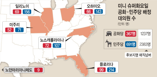 미국 대통령 선거 경선 레이스의 분기점인 ‘미니 슈퍼화요일’에 공화당의 도널드 트럼프와 민주당의 힐러리 클린턴 전 장관이 승리를 거두며 대세론을 확인했다. ‘공화당 주류의 희망’으로 불리던 마코 루비오 상원의원은 자신의 지역구인 플로리다에서 승리를 내주며 결국 중도 하차했다.