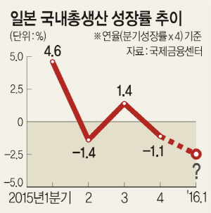 16일 국제금융센터 등에 따르면 일본 경제는 2015년 4분기 마이너스 성장에 이어 올해 초 금융시장이 크게 불안한 모습을 보이면서 경기 후퇴 가능성이 제기되고 있다. 지난해 4분기 성장률은 전 분기대비 -0.3%, 연율 -1.1%를 기록, 지난해 2분기(-1.4%) 이후 2분기 만에 마이너스로 돌아섰다.