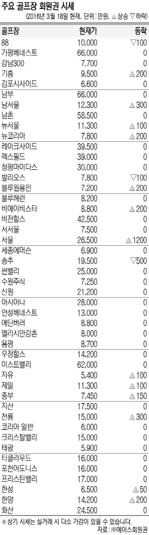 고가권에선 송추가 하락했지만 회원 혜택이 강화된 서울이 급등해 관심을 끌고 있다. 중가권에선 88이 단기 상승 후 숨 고르기 양상이고 기흥, 남서울은 상승세가 전개되고 있다.