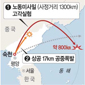 동해상으로 800㎞ 날아가 17㎞ 상공 1발 폭발한 듯