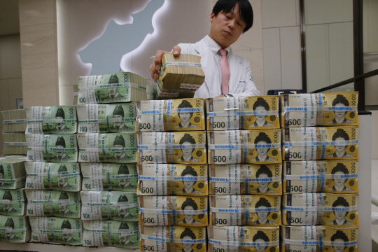 기업이나 개인이 쉽게 현금으로 인출해 쓸 수 있는 요구불예금의 회전율이 올해 1월 8년 11개월 만에 최저치를 기록한 가운데 17일 오후 서울 중구 명동 KEB하나은행 본점 위변조대응센터에서 한 직원이 현금을 정리하고 있다.