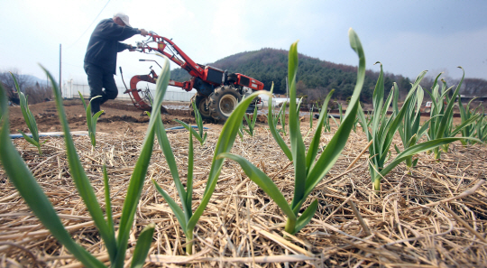 주말까지 반짝 꽃샘추위가 몰아닥친 속에도 23일 강원 춘천시 서면 금산리에서 농부가 농기계로 땅을 갈아엎으며 봄농사 준비를 하고 있다.