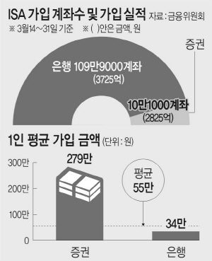4일 금융위원회와 금융업계에 따르면 ISA 상품 출시 후 15일(3월 14∼31일)간 가입 계좌 수는 120만 계좌, 금액은 6550억 원인 것으로 나타났다. 이중 은행권이 91.5%를 차지했으며 증권사는 8.4%에 그쳤다. 가입 금액 기준으로는 은행과 증권사가 각각 56.8%, 43.1%를 차지해 증권이 크게 밀리지 않았다. 가입자가 계좌에 담을 상품을 직접 선택하는 신탁형 비중이 98.7%로 일임형을 압도했다. 1인당 평균 가입금액은 은행이 34만 원, 증권 279만 원 등으로 55만 원이었다. ISA는 하나의 통장 안에 예·적금, 펀드 등 다양한 금융상품을 담아 운용할 수 있으며, 납부 한도는 연간 2000만 원, 의무가입기간은 3∼5년이다. 계좌에서 발생한 이익과 손실을 통산해 순소득 200만 원까지는 비과세, 초과분에 대해서는 9.9% 분리과세된다.