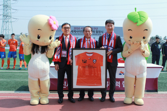 내년 상반기 경기 시흥시 배곧신도시에 프리미엄 아웃렛을 개점하는 조병하(오른쪽) 신세계사이먼 대표이사는 지난 2일 시흥시 정왕동 체육공원 축구장에서 김윤식(가운데) 시흥시장과 조욱희 FC시흥 대표이사를 만나 시민축구단 후원 협약을 맺었다.