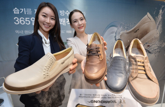 11일 서울 중구 명동 금강제화 매장에서 모델들이 신제품인 ‘랜드로바 고어텍스 서라운드’를 선보이고 있다.