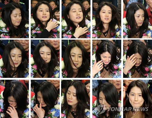 새누리당 서울 중구성동을 지상욱 당선인의 부인인 배우 심은하가 14일 새벽 지지자들에게 인사하기 위해 서울 중구 신당동 선거사무소에 들어와 다양한 어색한 모습을 짓고 있다.