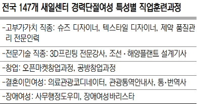 슈즈디자이너·의료관광코디네이터 양성과정 등 경력단절여성(경단녀)의 전문직 재취업을 돕는 670여 개의 직업훈련과정이 여성가족부 지정 여성새로일하기센터(새일센터)에서 운영되고 있다.