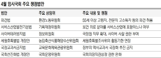 21일부터 시작된 4월 임시국회에서는 주로 무쟁점 법안들이 통과되는 대신 여야가 첨예하게 대치 중인 법안 처리는 쉽지 않을 전망이다. 이에 따라 노동개혁 관련 4개 법안 및 서비스산업발전기본법 등의 주요 법안들이 19대 임기 종료와 함께 자동 폐기되는 수순을 밟는 것이 아니냐는 관측이 나온다.