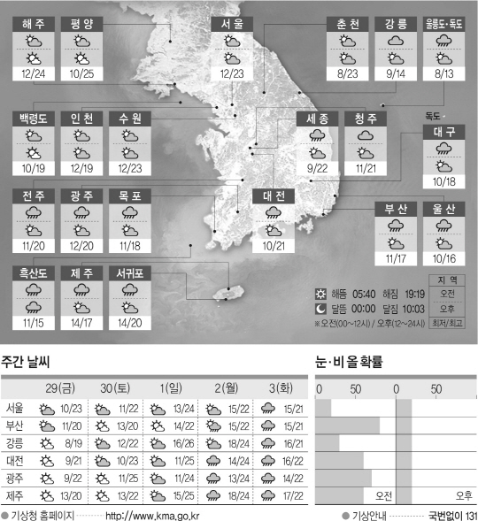 전국이 대체로 흐리고 충청 이남 지역에는 비(강수확률 60∼80%)가 오다가 새벽에 충청남북도부터 그치기 시작해 낮에 대부분 그치겠다. 아침 최저기온은 8도에서 13도, 낮 최고기온은 13도에서 23도가 되겠다.