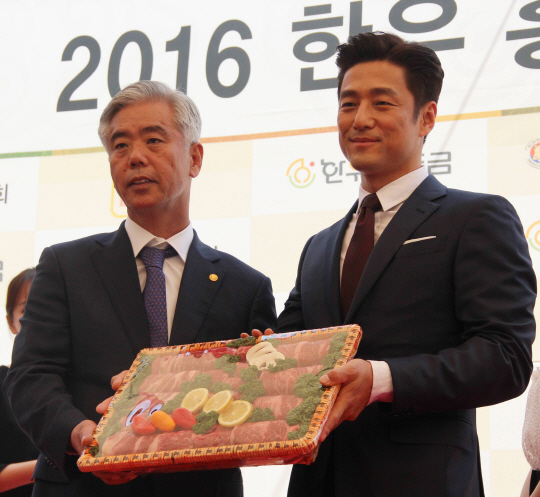 배우 지진희(오른쪽)가 2016년 한우 홍보대사로 위촉됐다. 한우자조금관리위원회(위원장 이근수)는 26일 서울 중구 ‘한국의 집’ 중정(안마당)에서 한우홍보대사 위촉식을 진행했다.