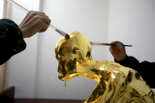 지난 3월 16일 중국 푸젠성 취안저우에서 사람들이 푸호 스님 시신에 금을 입히고 있다. 사원 측은 푸호 스님이 2012년 94세의 나이로 별세하자 그의 불교적 업적을 기리기 위해 시신을 보관해 왔다. 중국 일부 지역에서는 뛰어난 고승이 열반하면 미라 불상을 만드는 관습이 있다.