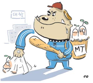 대학가가 MT철을 맞아 선배들의 후배 ‘군기 잡기’로 몸살을 앓고 있다. 모임의 성격도 MT(멤버십 트레이닝)에서 ‘AT(애니멀 트레이닝)’로 변질됐다. ‘짐승을 다루듯이 훈련을 시킨다’는 뜻의 AT는 대학에서 벌어지는 폭력 행위를 지칭하는 은어다.