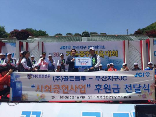 최용석(앞줄 가운데) ㈜골든블루 부회장은 지난 1일 부산 사직종합운동장에서 부산지구 청년회의소(JC)와 지역 경제 활성화및 소외 이웃 지원사업을 공동 진행하는 내용의 지역사회발전 협약에 서명한 후 한문갑 부산JC 회장에게 후원금을 전달했다.