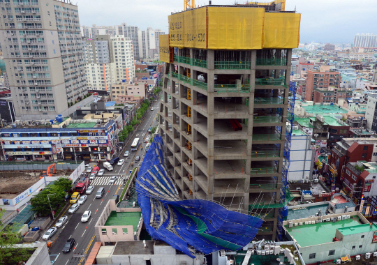 전국 곳곳에 강풍 경보가 내려진 3일 오전 부산 사상구 괘법동의 한 신축공사 현장에서 건물 외벽에 설치됐던 비계가 바람에 무너져 있다.