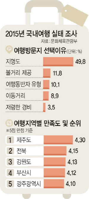 ◇여행, 어디로 가나 = 여행의 주요 방문 지역은 경기와 서울, 충남, 경남, 강원 등의 순으로 나타나 전년도와 거의 유사했다. 여행지 중에서 만족도가 가장 높은 지역은 제주로 5점 만점에 4.30점을 받아 전체 평균 4.04점을 크게 상회했다. 이어 전북(4.15점), 강원(4.13점), 부산(4.12점)의 순이었다.