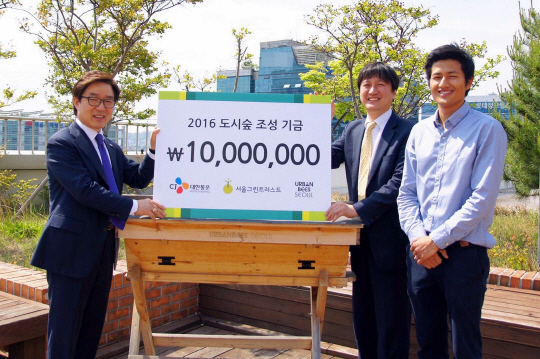 백유택(왼쪽) CJ대한통운 상무가 설동근(가운데) 서울그린트러스트 운영위원장, 박진 어반비즈 서울 대표와 지난 12일 서울 금천구 가산동 CJ대한통운 택배터미널 옥상에서 ‘2016 도시숲 조성 기금’ 전달식을 가졌다.