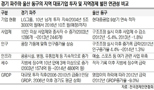 울산 동구의 이러한 사정은 LG그룹이 2004년 LG디스플레이 생산공장 투자를 시작으로 액정표시장치(LCD) 클러스터 조성 투자를 하고 있는 경기 파주 지역과 뚜렷하게 대비된다고 전경련은 설명했다.