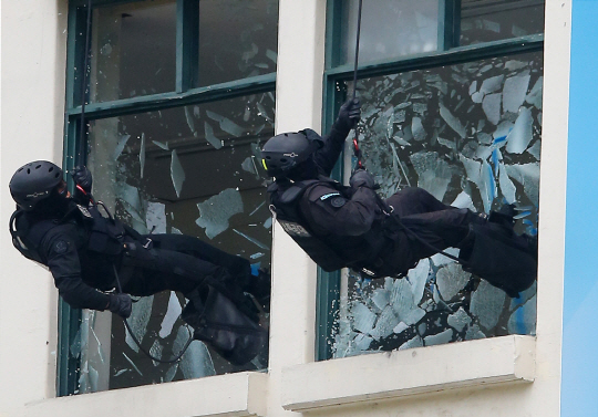 경찰특공대원들이 26일 서울 서초구 방배동 서울경찰특공대에서 열린 주한 외국공관 보안총괄책임관 안전협의체 발족식에서 줄을 타고 건물을 내려와 유리창으로 진입하는 시범을 보이고 있다.