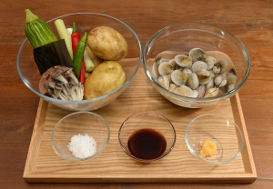감자 3개, 소금 약간, 참기름, 애느타리버섯 한 줌, 애호박 1/8개, 청고추 1/3개, 홍고추 1/3개, 대파 1/4개, 간마늘 1/4작은술, 조개육수 재료(물 8컵, 말린표고 1개, 모시조개 400g, 다시마 5×5㎝ 1장)