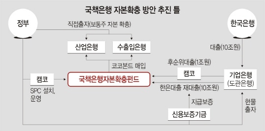 하지만 국책은행 자본 확충 규모는 자본확충펀드(한은 10조 원, 기업은행 후순위대출 1조 원)와 직접출자(1조 원 이상)를 합해 12조 원 이상으로 추정치보다 많다. 향후 예측하지 못한 상황에 대비하기 위해 충분한 규모를 사전에 준비할 필요가 있었기 때문이라는 게 정부의 설명이다. 자본확충펀드를 통한 자금 투입은 필요할 때마다 자금을 마련하는 ‘캐피털 콜(Capital Call)’ 방식으로 이뤄진다. 정부는 당장 수은의 BIS비율을 10.5%에 맞추기 위해 9월 말까지 공기업 주식 등을 활용해 1조 원을 현물 출자하기로 했다. 내년 예산에는 현금 출자 소요를 반영하기로 해 국책은행 자금 지원에 대한 국회 동의를 밟게 된다. 자본확충펀드는 한은과 정부가 ‘도관은행’(돈이 흘러나가는 파이프 역할을 하는 은행)인 기업은행에 자금을 대출하고, 이 돈이 특수목적법인(SPC)에 들어간 뒤 SPC에서 조성한 자본확충펀드가 산은과 수은이 발행하는 코코본드(조건부 자본증권)를 인수하는 방식으로 운영된다. 또한 신용보증기금의 지급 보증을 통해 한은 대출금을 조기에 회수할 수 있도록 했다. 자본확충펀드는 7월부터 가동된다.