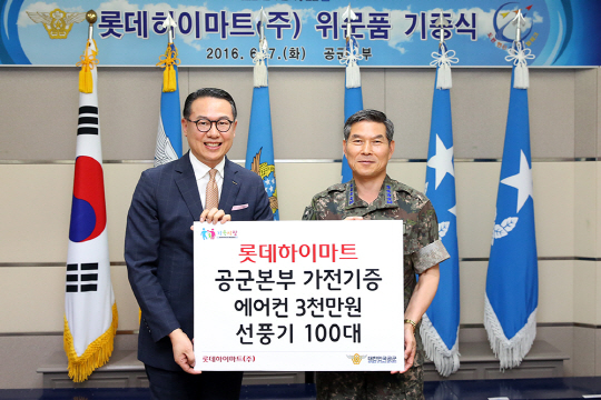 이동우(왼쪽) 롯데하이마트 대표이사는 7일 충남 계룡시 공군본부를 찾아 정경두 공군참모총장에게 공군 장병들의 여름나기를 위한 위문품으로 3500만 원 상당의 에어컨과 선풍기를 전달했다.