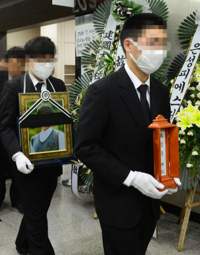 서울 지하철 2호선 구의역 스크린도어 수리 도중 숨진 김모 군의 유가족이 9일 오전 서울 광진구 건국대병원 장례식장에서 거행된 발인식에서 고인의 영정을 들고 있다.