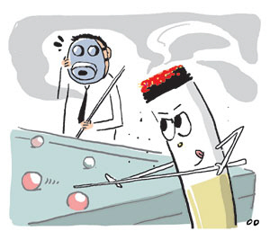 ‘흡연 무풍지대’인 당구장의 간접흡연에 의한 초미세먼지(PM2.5) 노출 수준이 일반 음식점보다 40배가량 높은 것으로 나타났다. 실내 초미세먼지 수준이 세계보건기구(WHO)의 ‘실외’ 기준치보다 2배 이상 높다는 연구결과가 나와 대책 마련이 시급하다는 지적이다. 체육시설은 국민건강증진법에 따라 금연구역에 해당하지만, 1000명 이상 대규모 체육시설만 금연구역으로 지정되는 탓에 당구장은 흡연을 해도 제재할 근거가 없는 상태다.