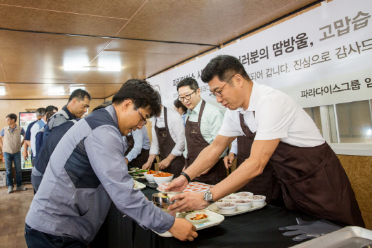 전필립(오른쪽 첫 번째) 파라다이스그룹 회장과 임직원들이 14일 인천 영종도에 건립 중인 복합 리조트 ‘파라다이스 시티’에서 협력사 상생경영의 하나로 협력업체 임직원 2600명에게 삼계탕 배식을 하고 있다.
