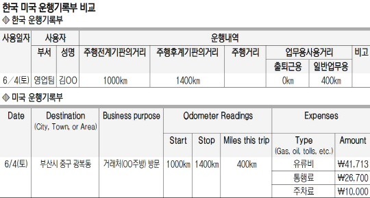 비슷한 제도를 시행 중인 미국과 캐나다, 호주 등이 출발·도착지, 사용목적 등을 예외 없이 기재토록 한 것과도 대조적이다. 미연방국세청(IRS) 세금간행물에 고시된 업무용차 운행기록을 보면 운행일과 도착지, 사용목적, 출발·도착시 누적주행거리, 운행거리, 유지비 지출액(유류비·통행료 등) 등 9개 기재사항이 있다. 호주 역시 사용날짜와 자택주차일수, 출발·종료시 누적주행거리, 운행거리, 개인용도 운행거리, 업무상 운행거리 등은 물론 출발·목적지와 사용목적을 서술토록 했다. 운행기록부만으로 업무용 사용 여부 판단이 사실상 불가능함에 따라 추가서류를 구비해 놓지 않으면 탈세 의혹을 받을 수 있다는 지적도 제기된다. 예컨대 회사차로 주말에 서울에서 부산 거래처를 방문할 경우 국세청 운행기록 양식으로는 날짜와 400㎞ 주행 사실만 확인돼 출장보다 주말여행으로 오해받기 쉽다.