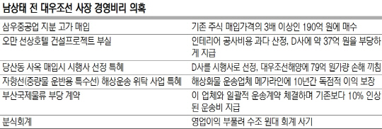 ◇경영 비리 핵심 남상태=검찰은 일단 남 전 사장의 개인 비리 중심으로 수사한 뒤 회계사기 묵인 또는 지시 의혹이나 정·관계 연임 로비 의혹 등 혐의를 추가로 추궁한다는 방침이다. 2006년 대우조선해양 대표이사에 취임한 뒤 한 차례 연임을 거쳐 2012년까지 6년간 CEO 자리를 지킨 남 전 사장은 측근들에게 일감을 몰아주고 부당이득을 챙긴 혐의를 받고 있다. 대우조선해양 감사위원회가 검찰에 진정서를 내 남 전 사장을 수사해 달라고 할 정도였다. 우선 구속된 대학동창 정모(65) 씨가 대주주로 있는 회사에 일감을 몰아주고 부당이득을 챙긴 혐의를 받고 있다. 특히 남 전 사장은 대우조선해양의 ‘손자회사’격인 정 씨 소유 회사 지분을 차명으로 보유해 수억 원대 배당 소득을 챙긴 것으로 보고 있다. 오만 선상 호텔 사업, 서울 당산동 사옥 매입 과정에서는 건축가 이창하(60) 씨에게 사업상 특혜를 줬다는 의혹도 있다. 이 씨에게 돌아간 수백억 원대 특혜 중 일부가 비자금으로 조성된 것 아니냐는 의혹도 나온다.