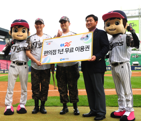 허연수(오른쪽 두 번째) GS리테일 대표이사는 지난 24일 서울 송파구 잠실야구장에서 북한 목함지뢰 부상을 극복한 하재헌(〃 세 번째), 김정원(〃 네 번째) 하사에게 GS25 연간 이용권(365만 원)을 전달했다.