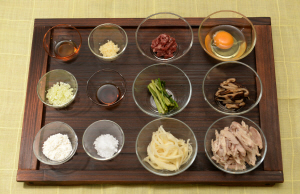 닭 1마리(약 1㎏ 내외), 도라지·미나리 각 한 줌씩, 다진 쇠고기 60g, 마른 표고버섯 2장, 밀가루 2큰술, 달걀 1개, 소금 약간, 육수재료(마늘 2톨, 생강 1톨, 감초 1개, 황기 1줄기, 통후추 10알, 물 3리터), 닭양념(소금 1/2작은술, 다진마늘·다진파·참기름 1작은술 씩, 후춧가루 약간), 고기양념(국간장·다진파 1작은술씩, 다진마늘 1/2작은술, 참기름·후춧가루 약간씩)