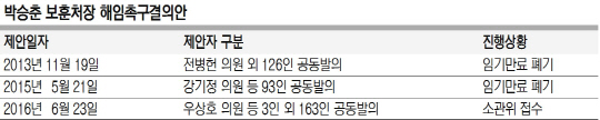 박 처장 해임건의안은 2013년 11월, 2015년 5월에 이어 이번이 세 번째다. 야당은 또 보훈처가 5·18 당시 계엄군으로 투입된 제11공수특전여단이 참여하는 6·25전쟁 기념 시가행진을 광주에서 추진하자 박 처장 해임을 요구하며 반발했다.