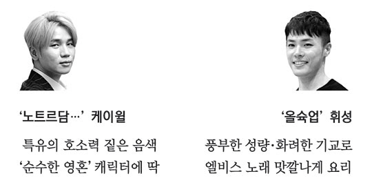 가수로서의 명성은 잠시 내려놓고, 각각 콰지모도(노트르담 드 파리·왼쪽 사진)와 엘비스 프레슬리(올슉업·오른쪽)라는 가면을 썼다. 뮤지컬 무대에서 두 사람은 아직 신인. 그러나 케이윌의 호소력 짙은 목소리는 순수한 영혼을 가진 콰지모도와 잘 맞아떨어졌고, 휘성은 풍부한 성량과 화려한 기교로 프레슬리의 히트곡을 맛깔스럽게 요리했다.