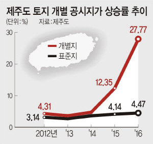 전국 최고 부동산 가격 상승률을 보인 제주에서 개별 공시지가 상승률이 27.77%를 기록하자, 수익 실현에 앞서 세 부담이 먼저 크게 늘 것이라는 현지 지주들의 우려의 목소리가 커지고 있다.