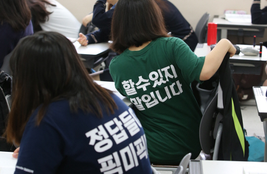 전국연합학력평가 시험이 치러진 6일 오전 서울 은평구 통일로 신도고등학교에서 3학년 학생들이 ‘할 수 있지 말입니다’ ‘정답들이 픽미 픽미’ 등의 문구가 적인 티셔츠를 입은 채 시험준비를 하고 있다.